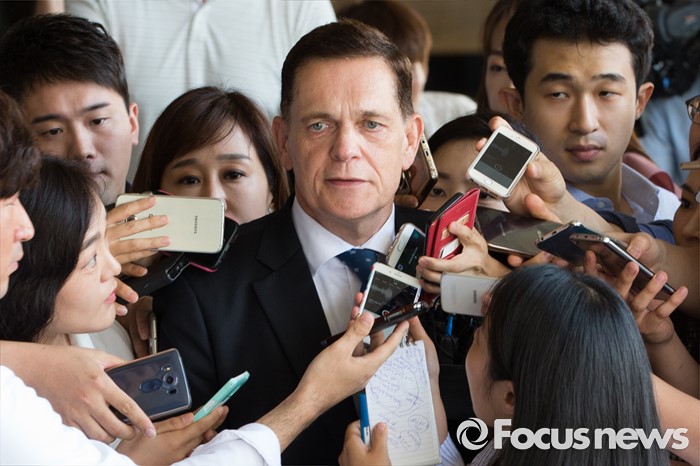(서울=포커스뉴스) 폭스바겐 배출가스 조작 의혹을 받고 있는 요하네스 타머 아우디폭스바겐코리아 총괄사장이 11일 오전 서울 서초구 서울중앙지검으로 출석해 취재진의 질문을 받고 있다.