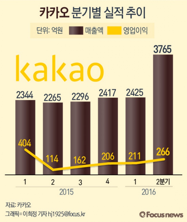 (서울=포커스뉴스) 11일 카카오는 올해 2분기 매출액은 3765억, 연결 기준 영업이익은 전년 같은기간 대비 132.8% 증가한 266억원으로 집계됐다고 공시했다.