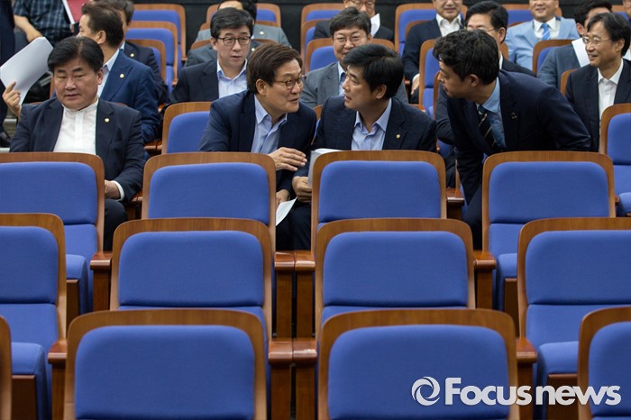 (서울=포커스뉴스) 사드배치에 반발하는 중국 측 입장을 듣기 위해 중국을 방문하고 돌아온 더불어민주당 의원들이 11일 오전 서울 여의도 국회에서 열린 의원총회에 참석 하고 있다. 왼쪽부터 소병훈 의원, 신동근 의원, 김병우 의원. 김영호 의원.