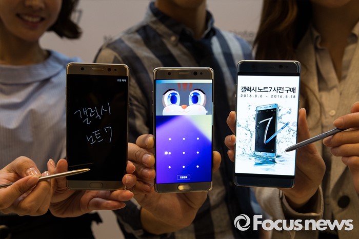 (서울=포커스뉴스) 11일 오전 서울 서초구 삼성전자 사옥에서 열린 '갤럭시 노트7 출시 미디어 행사'에서 모델들이 제품을 소개하고 있다.
