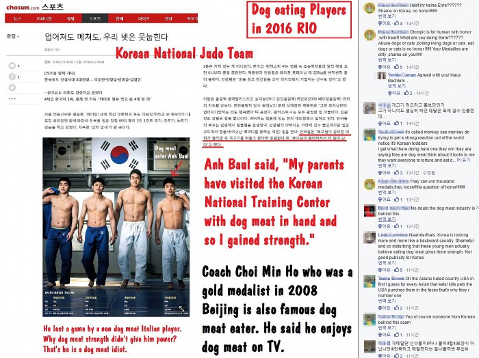 이에 해당 글에는 "개메달을 딴 선수들이 하나 둘씩...보양식 아니다. 인육 먹고 메달 땄다는 말이 나올까봐 무섭다", "개고기 먹으라는 홍보단인가. 그게 아니어도 열심히 하면 메달은 목에 걸 수 있을 텐데" 등 한국 사람들의 비판 적인 댓글과 함께 "역겨운 사람들(Disgusting people)", "이기적이고 어리석고 역겨운 구더기들(Selfish stupid disgusting maggots)" 등 외국인들의 험담이 줄이어 게재되고 있다.