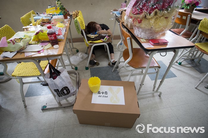 (안산=포커스뉴스) 세월호 참사에서 희생된 단원고등학교 학생들의 교실 이전 절차가 진행 중인 11일 오전, 경기도 안산시 단원고등학교 기억교실에서 2학년 2반 고 김수정 학생 어머니가 책상 정리를 하던 중 의자를 안고 울고 있다.
