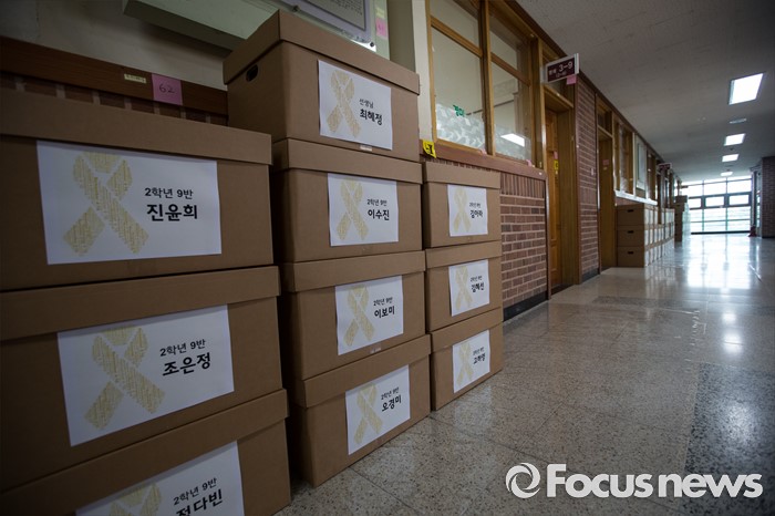 (안산=포커스뉴스) 세월호 참사에서 희생된 단원고등학교 학생들의 교실 이전 절차가 진행 중인 11일 오전 경기도 안산시 단원고등학교 기억교실 복도에 아이들 유품 및 기록물 보관함이 쌓여져 있다.