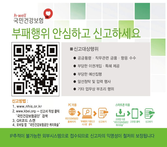 신고자는 공단 홈페이지(www.nhis.or.kr)에 설치된 ‘익명신고(헬프라인)’ 를클릭하거나 시스템 운용사인 웹사이트(www.kbei.org)에 접속하면 되며, 스마트폰의 경우 ‘국민건강보험공단 케이휘슬’ 어플을 설치하거나 익명신고 QR코드가 인쇄돼 있는‘클린스티커’를 스캔해 신고할 수 있다.