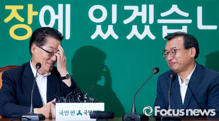 (서울=포커스뉴스) 11일 오후 서울 여의도 국회에서 박지원(왼쪽) 국민의당 비상대책위원장이 이정현 새누리당 대표와의 면담을 하고 있다.