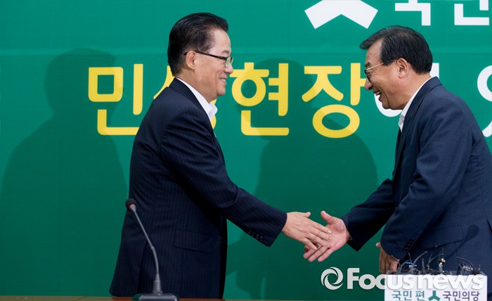 (서울=포커스뉴스) 11일 오후 서울 여의도 국회에서 박지원(왼쪽) 국민의당 비상대책위원장이 이정현 새누리당 대표와의 면담에 앞서 인사하고 있다.