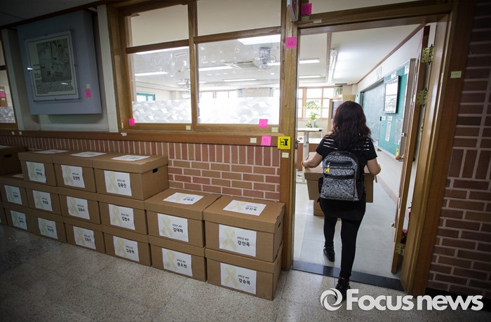 (안산=포커스뉴스) 세월호 참사에서 희생된 단원고등학교 학생들의 교실 이전 절차가 진행 중인 11일 오전, 경기도 안산시 단원고등학교 기억교실에서 한 희생자 아이의 어머니가 책상에 놓여진 유품을 수습하기 위해 기억교실을 들어서고 있다.