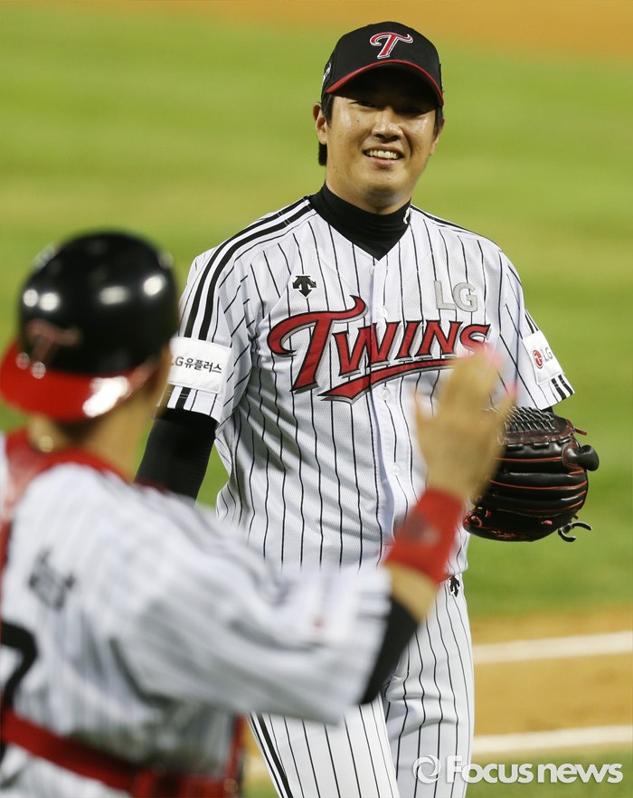 (서울=포커스뉴스) 11일 서울 잠실구장에서 열린 2016 프로야구 NC-LG 경기 7회초 2사 2,3루에서 LG 투수 김지용이 NC 모창민을 삼진 아웃으로 잡고 실점위기를 넘기며 포수 유강남과 함꼐 기뻐하고 있다.