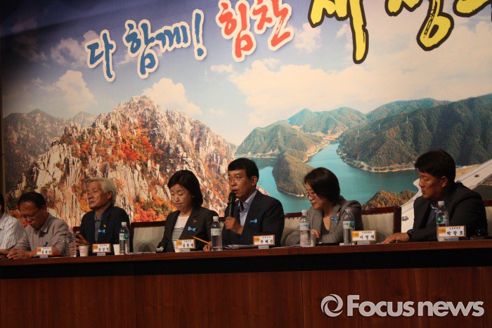 (성주=포커스뉴스) 10일 오후 성주군청 대회의실에서 열린 성주군민 간담회에 참석한 김종대 정의당 의원이 질의에 대답하고 있다.