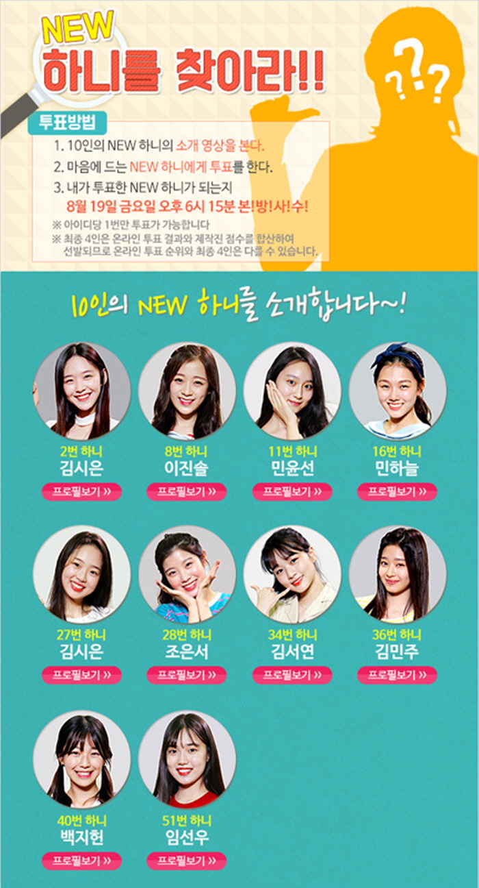 온라인 투표 미션 대상자로 된 10인에는 걸그룹 멤버를 포함해 다양한 끼와 재능을 가진 아이들이 선정됐다. 걸그룹 에이프릴의 멤버 이진솔, 춘천여고 골든벨녀 김서연, 10인 중 가장 어린 14살 백지헌을 포함해 김시은(17), 김시은(18), 민윤선, 민하늘, 조은서, 김민주, 임선우가 선발 됐다.