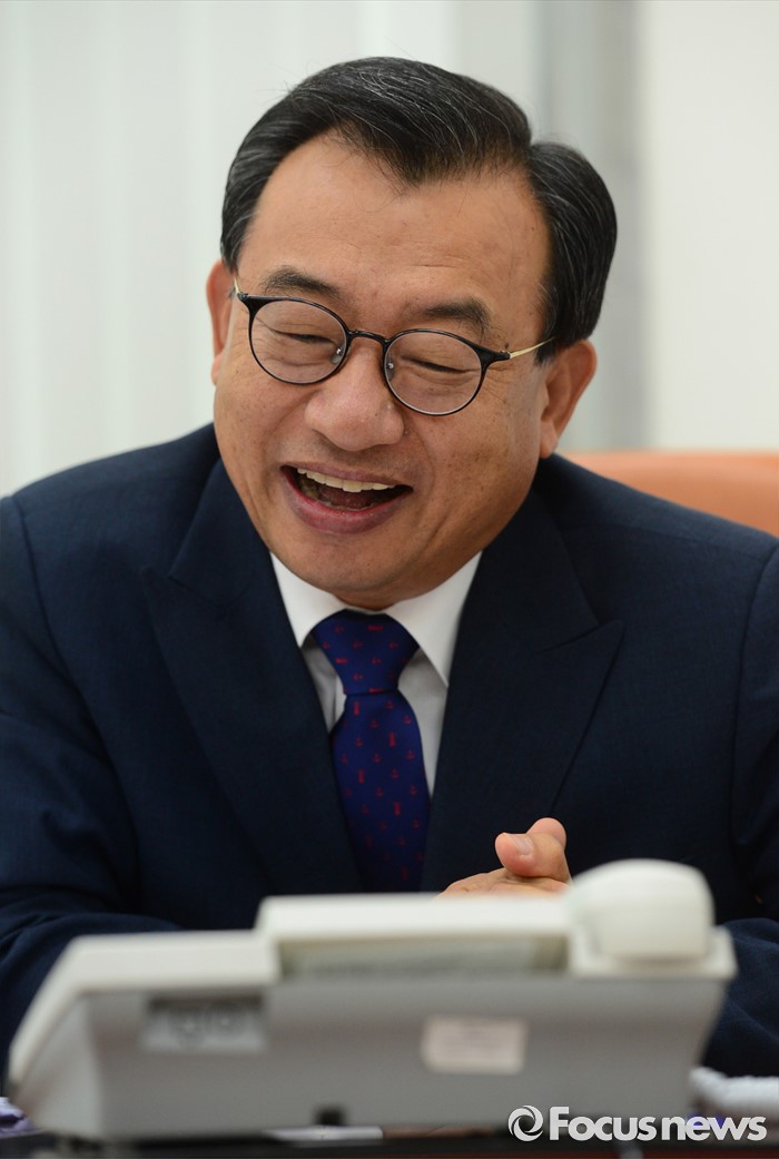 (서울=포커스뉴스) 이정현 새누리당 대표가 12일 오전 서울 여의도 국회 당대표실에서 정몽규 리우올림픽 선수단장과 격려 통화를 하고 있다.