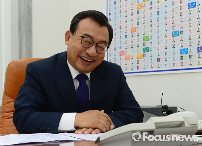 (서울=포커스뉴스) 이정현 새누리당 대표가 12일 오전 서울 여의도 국회 당대표실에서 정몽규 리우올림픽 선수단장과 격려 통화를 하고 있다.