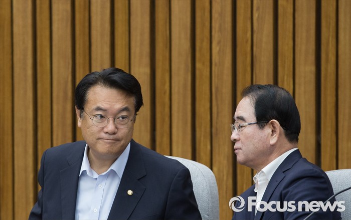 (서울=포커스뉴스) 정진석(왼쪽) 새누리당 원내대표와 박명재 사무총장이 12일 오전 서울 여의도 국회에서 열린 원내대책회의에 참석해 대화하고 있다.
